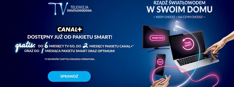 Zobacz naszą nową promocję Telewizji Światłowodowej !!! W najnowszej odsłonie TVŚ dla nowych Klientów zyskujesz do 1 abonamentu gratis. CANAL+ jest już dostępny od pakietu SMART do 2 miesięcy gratis. Dodatkowo otrzymasz usługę TV GO do 6 miesięcy gratis !!! Zadzwoń do nas i dowiedz się więcej !!!