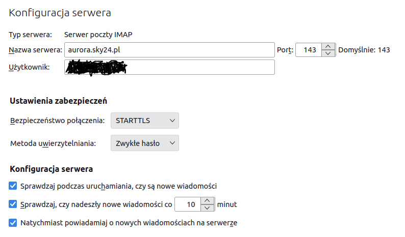Zmianie ulegają związku z tym ustawienia poczty. Nowy serwer obsługuje szyfrowanie połączeń (STARTTLS) w związku z czym proszę o aktualizację nazwy serwera na aurora.sky24.pl – by nazwa była zgodna z certyfikatem let’s encrypt.
